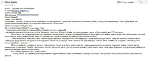Дальше представлено первоначальное письмо от жертвы лохотрона ТрейдГЛ, которая кинула его на сумму почти 12 000 долларов.