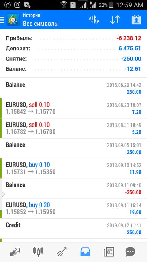 Баланс по счету отображает полную картину, где можно увидеть, как лился счет и оставшиеся 6500 долларов, были выброшены на ветер аналитиками кухни ТрейдГЛ.