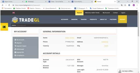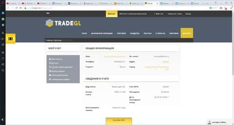 Здесь же изображено страницу с данными счета на сайте кухни TradeGL, на которой находятся данные разделы про общую информацию пострадавшего клиента и сведения о его счете в жуликов. Перейти на нее можно только после регистрации у аферистов ТрейдГЛ.