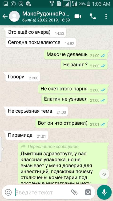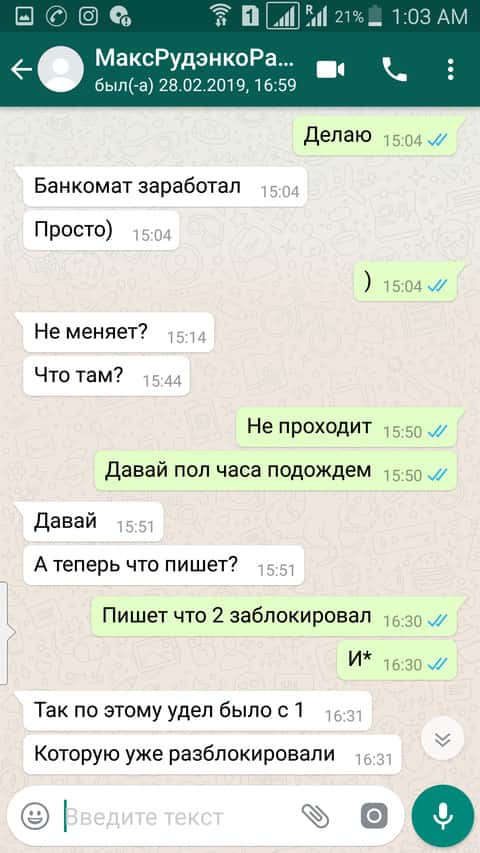 Максим Руденко пытался избежать разговора с пострадавшим клиентом, путем спихивания вины и игнорирования со стороны аферистов ТрейдГЛ на финансовый отдел. Так же он обещал как то повлиять на ситуацию, однако это были пустые слова и попытки тянуть время.