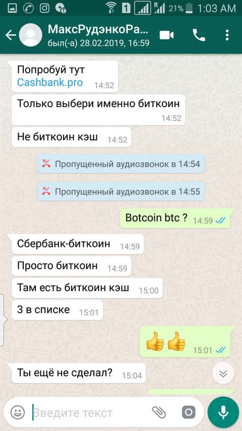 А дальше можно увидеть, как шарлатан ТрейдГЛ смог развести жертву еще на деньги и советует ему завести деньги через криптовалюту.