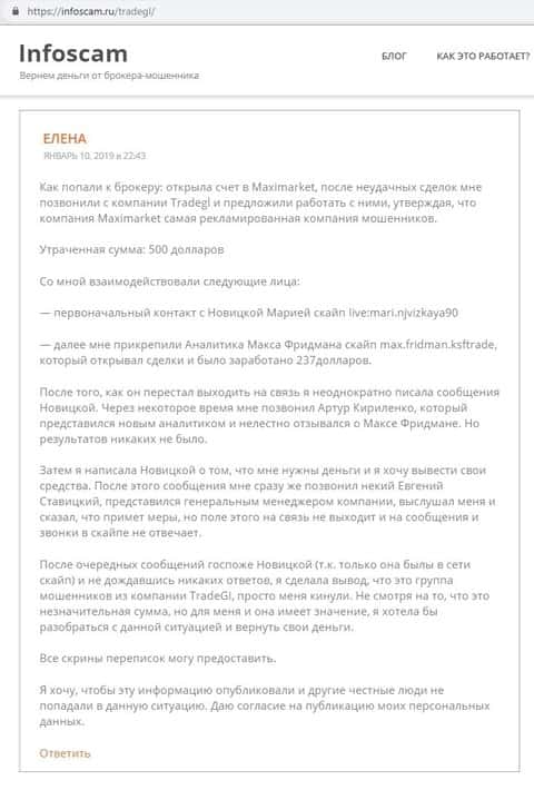 Отрицательный опыт и счет после сотрудничества с жуликами TradeGL получил еще один трейдер, который поделился отзывом на сайте инфоскам ру. С ним произошла та же стандартная история - позвонил менеджер Максим, предложил легкий заработок, ну а после клиента обманули и облапошили.