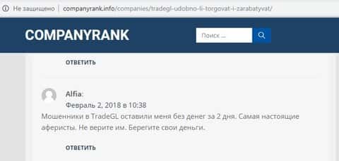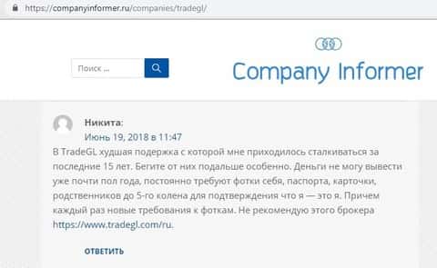 Есть негативное упоминание об мошенниках ТрейдГЛ и на интернет ресурсе компаниинформер ру. На данном источнике недовольные обманутые трейдеры высказывают свои гневные эмоции по поводу наглости и мошенничества кухни TradeGL, кидающей их на деньги.