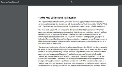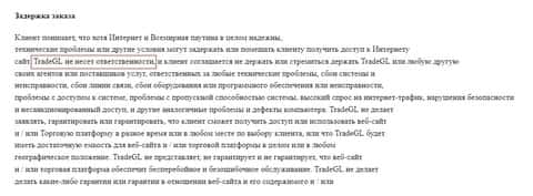 С самого начала кухонный брокер ТрейдГЛ в своих условиях и соглашениях прописывает пункт того, что вы соглашаетесь с его условиями и пляшете под дудку мошенников фактом использования сайта. Это типичный ход для подобных однодневных аферистов.