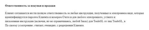Вышеупомянутый пункт об ответственности клиента, размещенный на сайте кухни ТрейдГЛ, присутствует и в соглашении. Его суть заключается в том, что компания TradeGL и ее представители не несут никакой ответственности за любые убытки, которые возникают при неправильном консультировании и помощи.