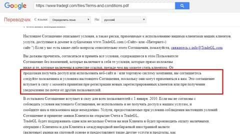 Довольно не удобным является тот факт, что условия и соглашения жуликов TradeGL приведены на английском языке без перевода. Благодаря этому факту аферисты ТрейдГЛ пытаются запутать клиентов, а именно понадеяться на их лень, и вызвать доверие, ведь англоязычным сайтам доверяют больше.