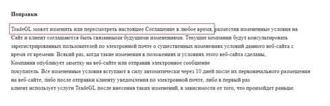 Ну и вишенкой на торте условий и соглашений аферистов ТрейдГЛ стал пункт того, что клиенты данного брокера соглашаются с любыми внесенными в условия и поправки пунктами. Так же это относится и к изменениям существующих пунктов. Таким образом мошенники TradeGL в очередной раз вас кидают.