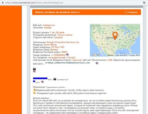 К тому же жулики TradeGL позиционируют себя как многолетний брокер с опытом и стажем. В условиях и соглашения аферистов ТрейдГЛ даже написано, что работают они 2010 года. Однако, проверив их через сайт скамадвайзер ком, можно выяснить, что их сайту нету и пары лет.