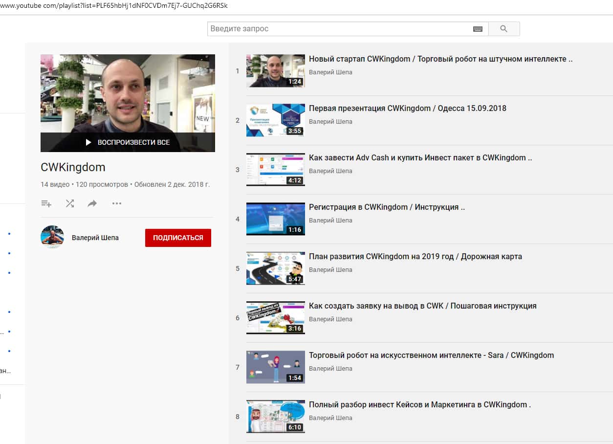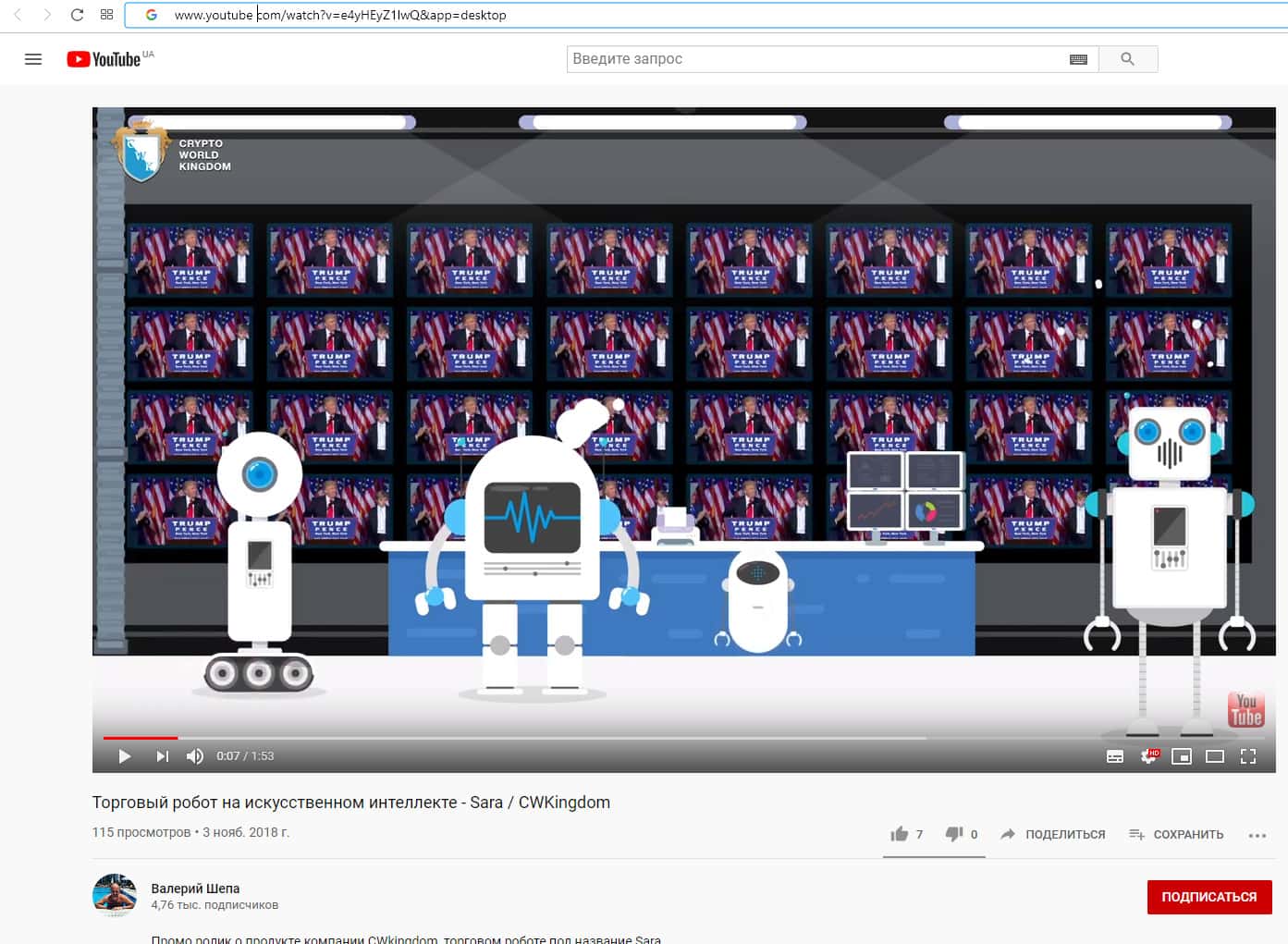Ниже мы можем увидеть канал одного из блогеров, который продвигал свой лохотрон под названием CWKingdom и соответственно там видео и было записано. Таким образом кухня использовала чью-то идею, а возможно и свою, а после соскамливания вообще подхватили эту выдумку с роботом Sara аферисты Трейдинг Картель.