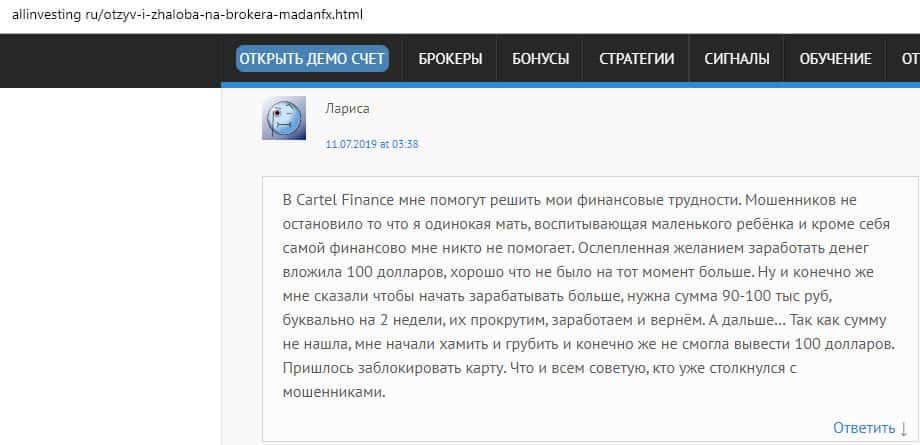 Далее представлен отзыв о кухне Cartel Trading, которая умудрилась обворовать даже одинокую мать. Аферисты достаточно хорошо ее обработали и после этого доверилась им практически полностью. Жертва вложила 100 долларов и мошенники стали просить вложить еще больше. Из-за грубости и хамства, со стороны менеджеров она раскусила, что это афера.