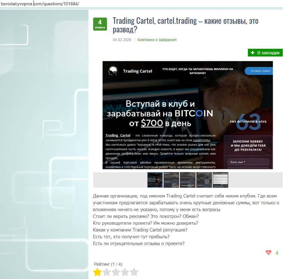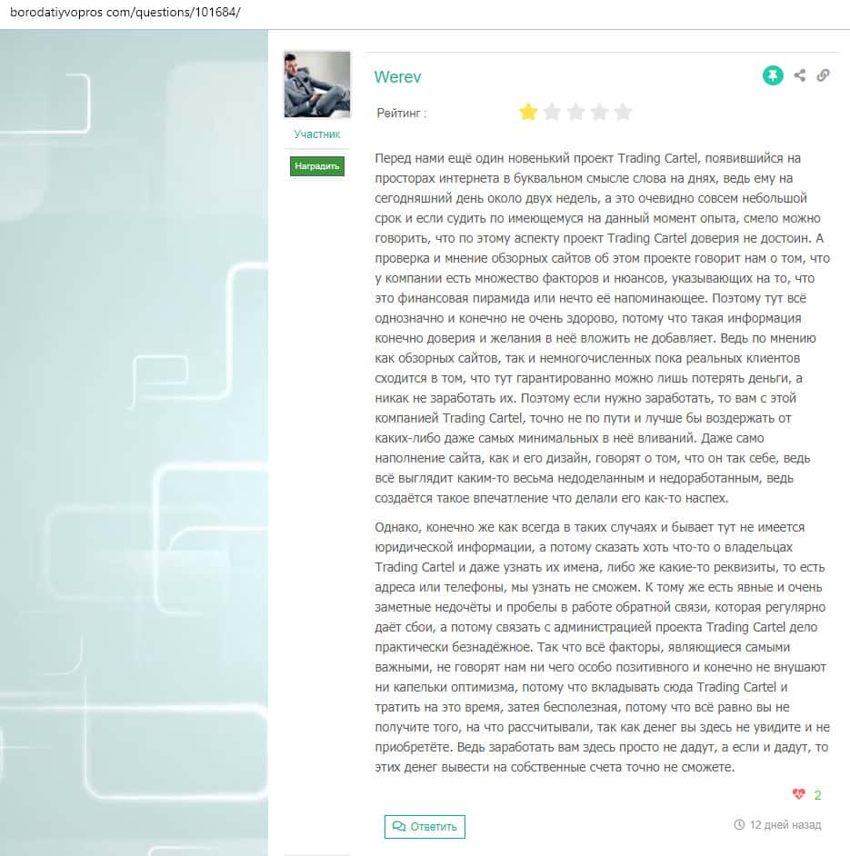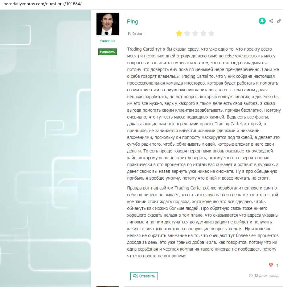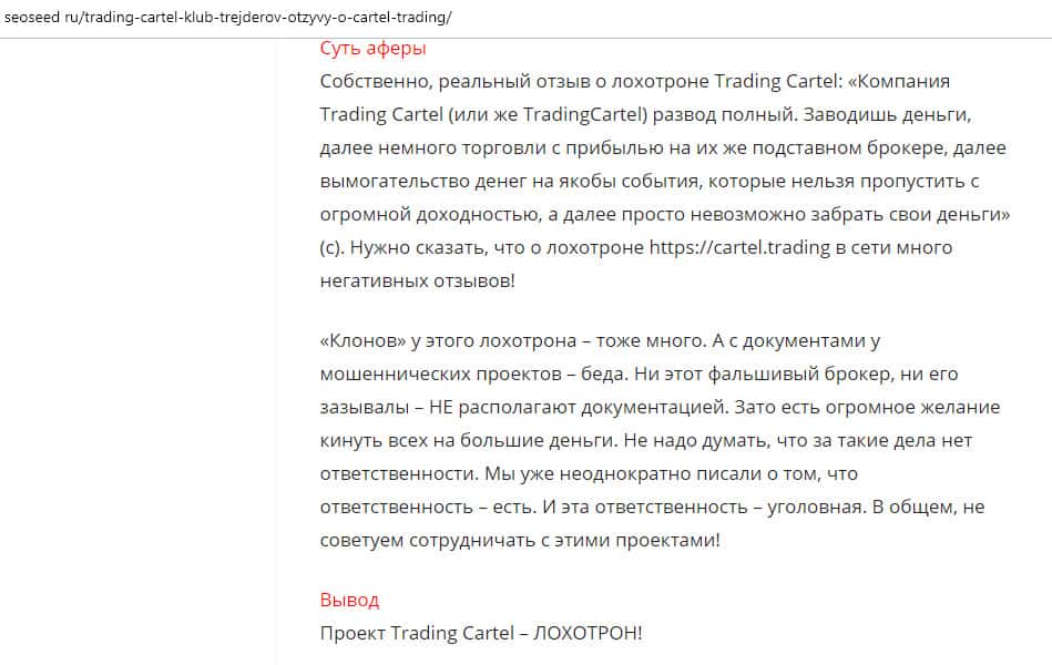 - Липовые отзывы от шарлатанской организации Cartel Trading