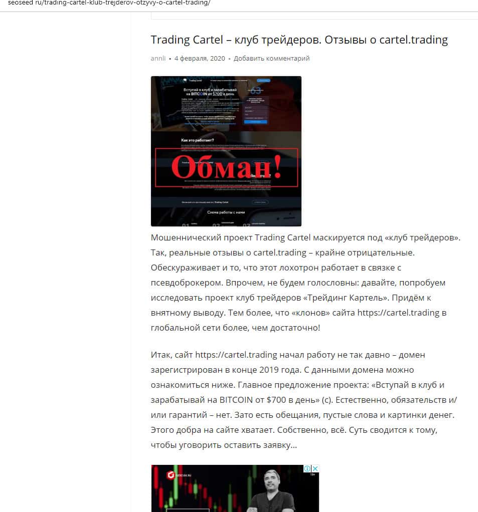 Шарлатанская контора Трейдинг Картель попалась в обзор еще одного ресурса, который полностью раскрыл ее суть. По словам автора статьи это якобы закрытый клуб трейдеров, где есть супер-робот, который приносит кучу денег. В общем лохотронщики используют все методы, дабы привлечь жуликов к себе.