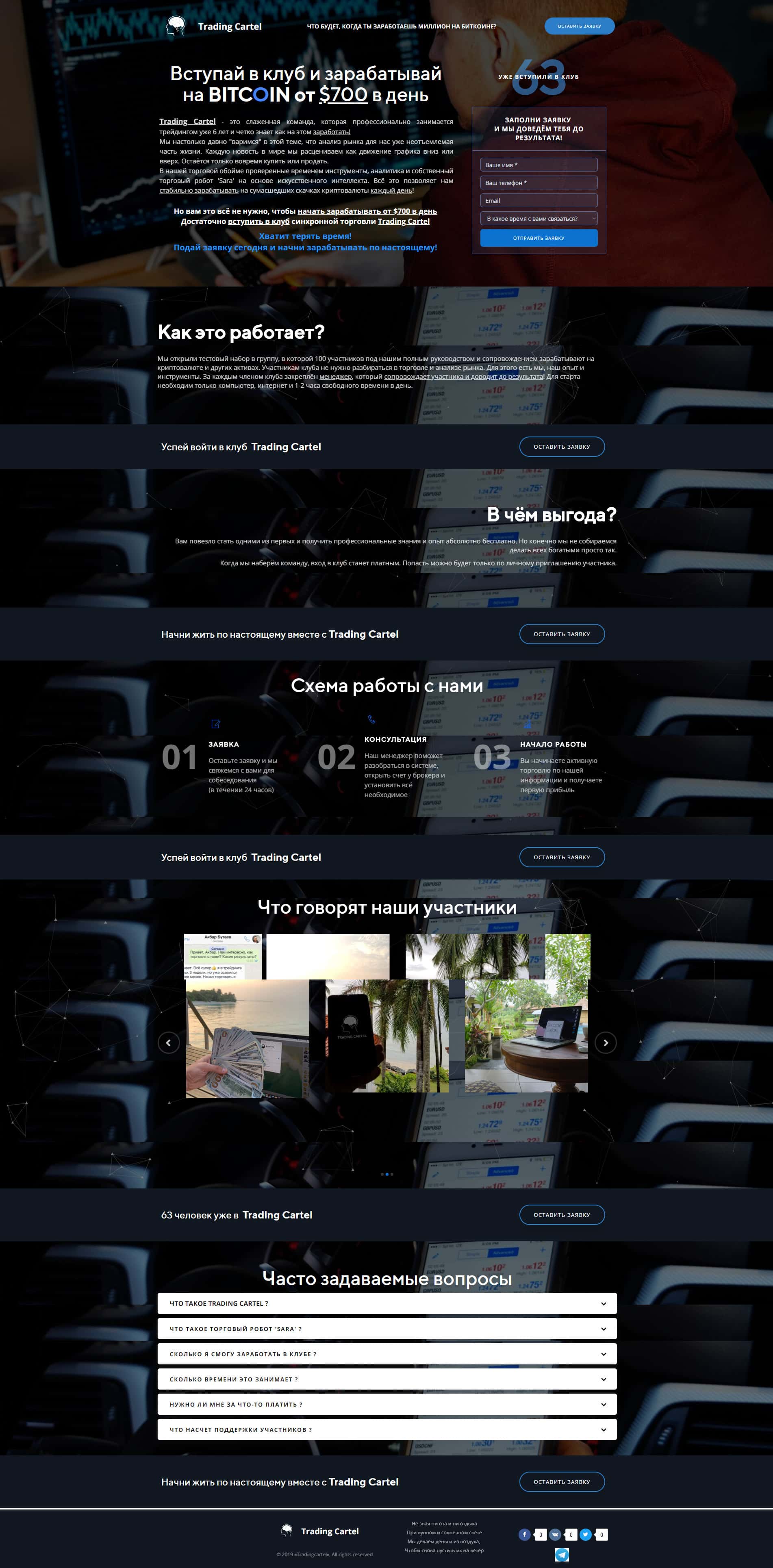 Чтобы разобраться, что из себя представляет контора Трейдинг Картель, нужно для начала проверить их официальный сайт. Можно точно сказать, что аферисты не тратились особо на его создание, поэтому решили уместить всю информацию на одну страничку. Конечно же это сопровождается красочными картинками и голословными лозунгами о богатстве.