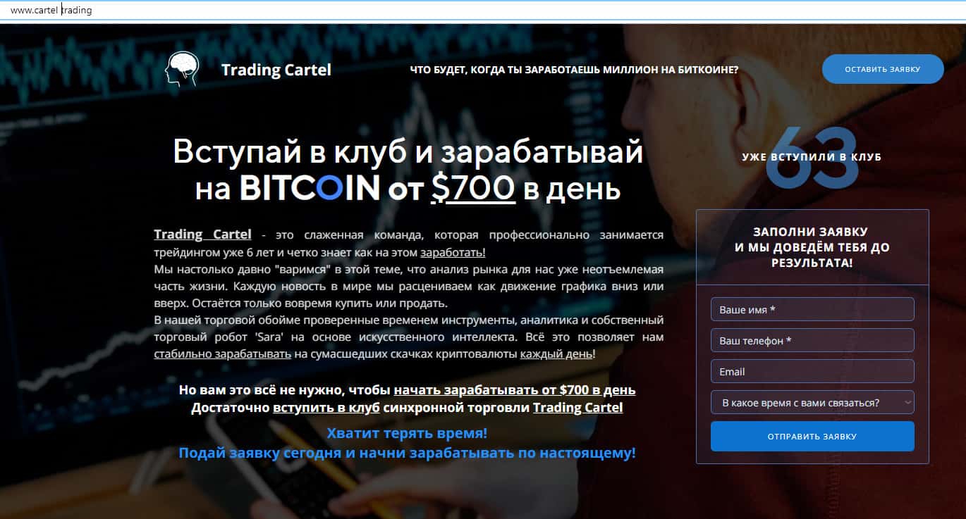 Cartel Trading - мошенническая контора, которая организовала псевдо-инвестиционный клуб, который толкает среди участников торгового робота Sara. Они обещают клиентам заработок в 700 долларов, при чем не нужно ничего делать. По сути это дикий развод, который рассчитан на последних лохов.