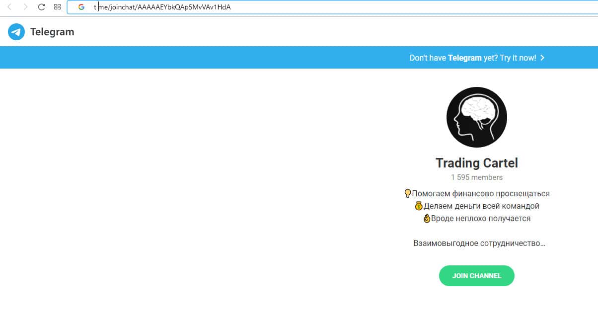 Второй вариант с группой Телеграм, которая насчитывает уже больше 1500 настоящих и потенциальных жертв развода со стороны лохотрона Трейдинг Картель. Как обычно бывает, большая половина всех участников - это обычный боты и рекламщики, которые через время попросту удаляют свой аккаунт за спам.