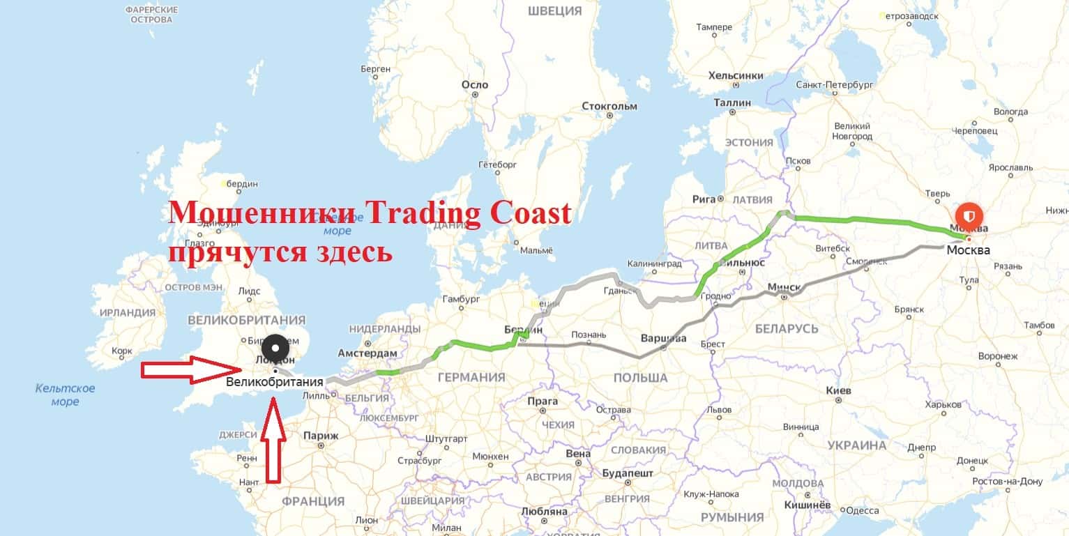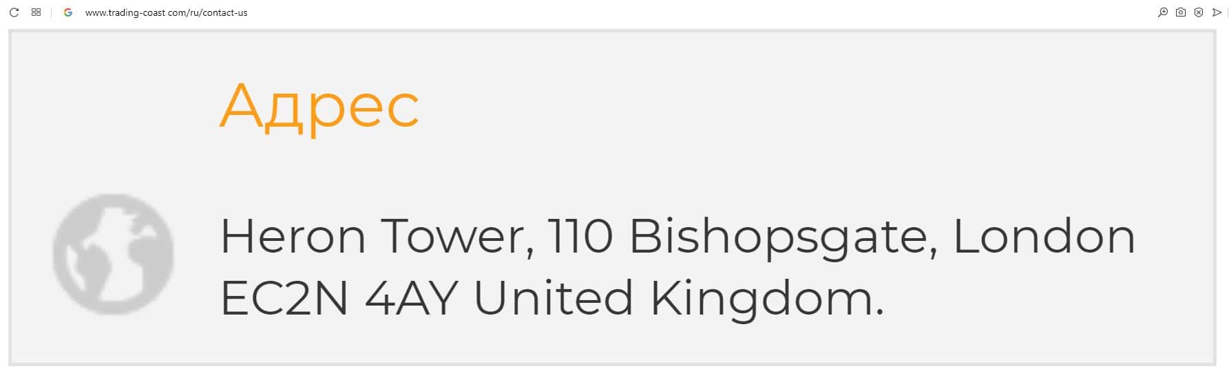 Сведения о месте регистрации Трейдинг Коаст - фейк, мошенники себя на сайте указывают адрес места регистрации на территории Великобритании в качестве приманки.