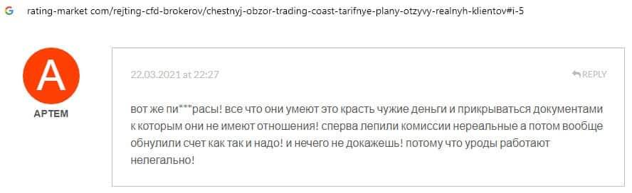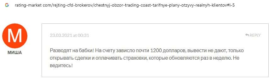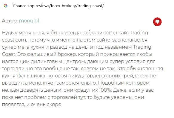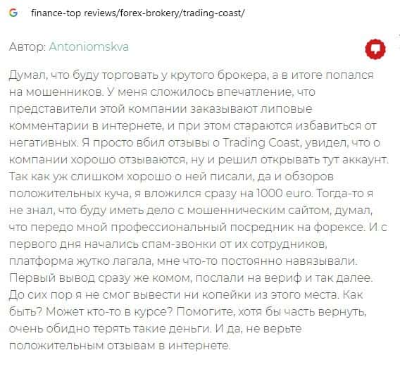 Далее предлагаем ознакомиться с комментарием одного из пользователей, который также убедился в том, что псевдо-брокер Trading Coast не выводит деньги со счета.