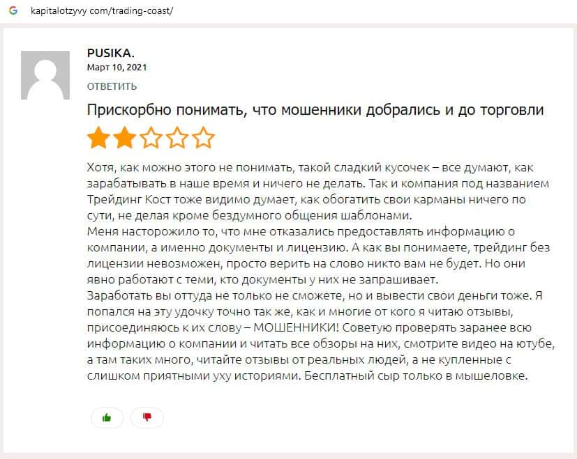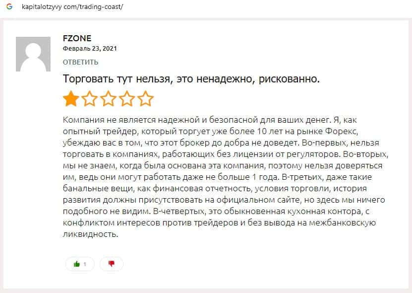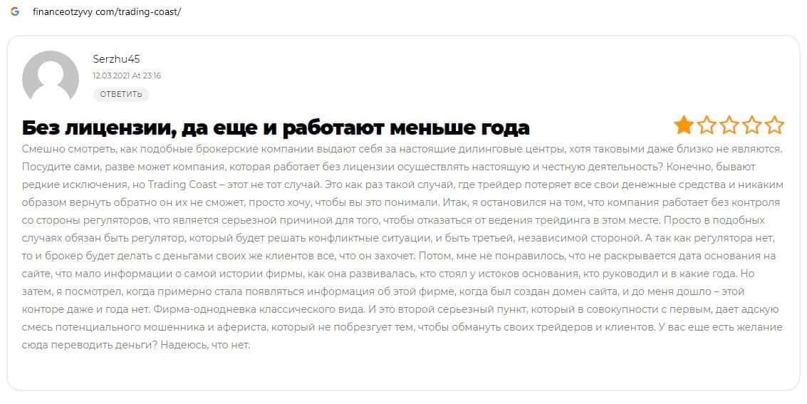 - Скам-брокеру Трейдинг Коаст не доверяют из-за отсутствия лицензии