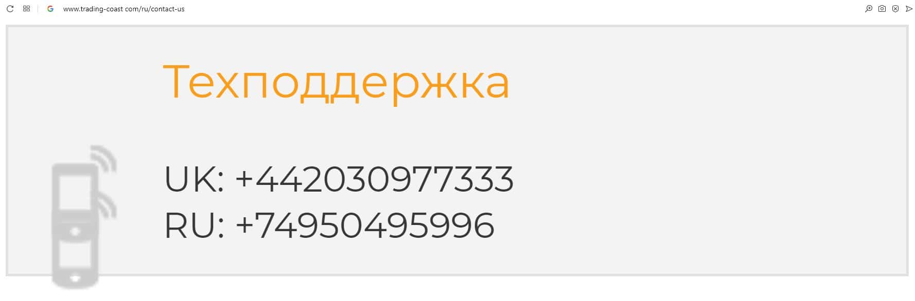 Обманщики Trading Coast на своем дырявом сайте указали два номера контактного телефона, с которых навязчиво названивают потенциальным жертвам: