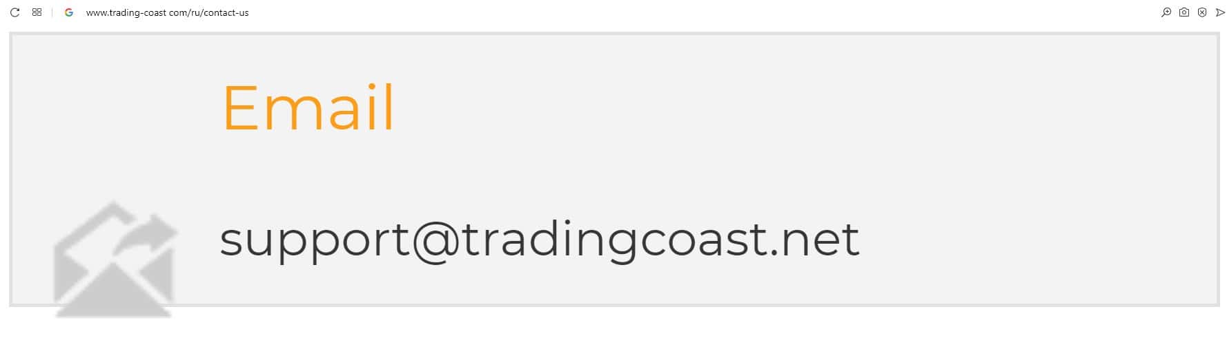 Аферисты Трейдинг Коаст на своем официальном интернет-ресурсе указывают адрес электронной почты, а именно: