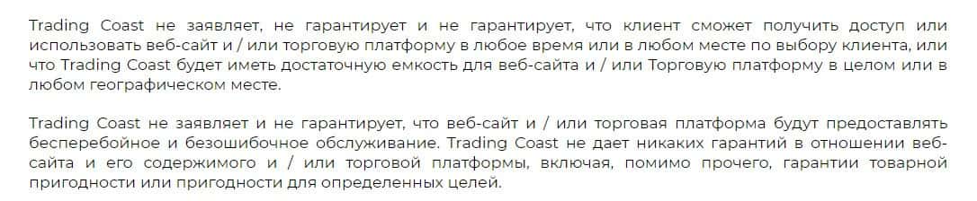 Лохотронщики Trading Coast не дают никаких гарантий того, что торговая платформа будет работать беспрерывно и без возможных системных ошибок.