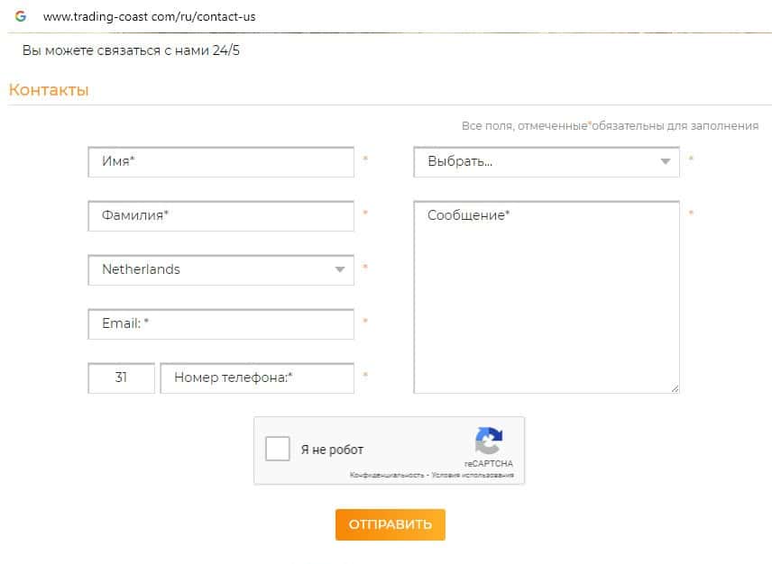 Шулера Трейдинг Коаст предлагают пользователям заполнить бланк сбора данных, где просят указать свое имя, фамилию, адрес электронной почты и номер контактного телефона.