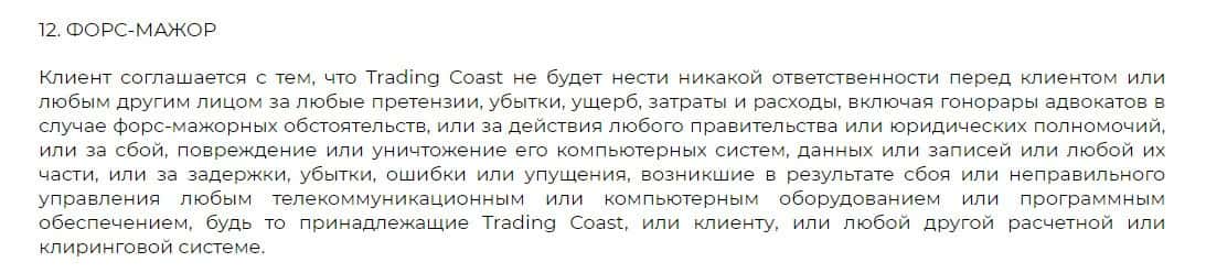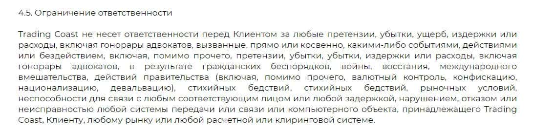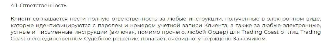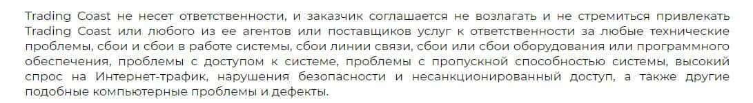 Согласно тому, что аферисты пишут в соглашении, компания Трейдинг Коаст не несет никакой ответственности за не полученную прибыль клиентом, а также за возможные убытки.