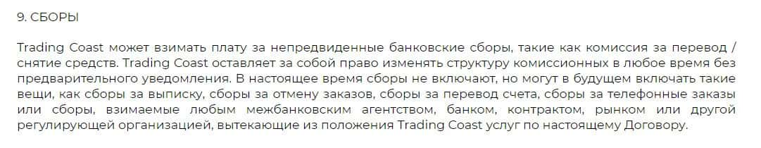 Клиент компании Trading Coast обязан оплачивать комиссию, а так же вымышленную страховку, либо же другие взносы выдуманные данной псевдо-брокерской организацией.
