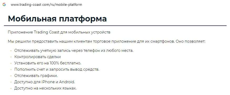 Лохотронщики Трейдинг Коаст предлагают скачать приложение на смартфон якобы для удобства торговли, что является приманкой для развода людей на деньги.