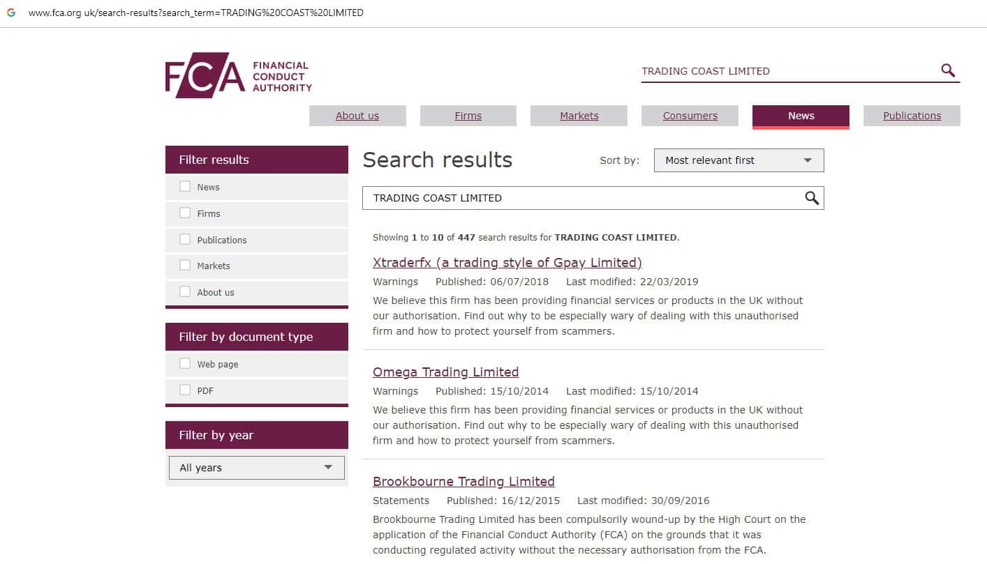 На официальном сайте финансового регулятора Великобритании fca org uk нет никаких данных о лицензии псевдо-брокерской компании Trading Coast.