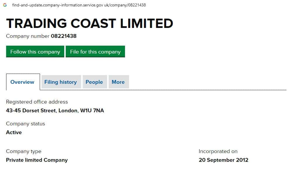 На сайте реестра компаний Великобритании beta companieshouse gov uk есть информация о регистрационном номере Трейдинг Коаст, что не является лицензией компании.