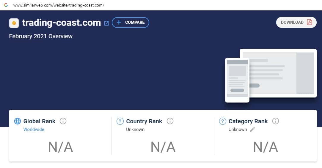 При проверке источников бренда по странам скам-компании Трейдинг Коаст на веб-ресурсе similarweb com, информация отсутствует, что является признаком фальшивого лохотрона.