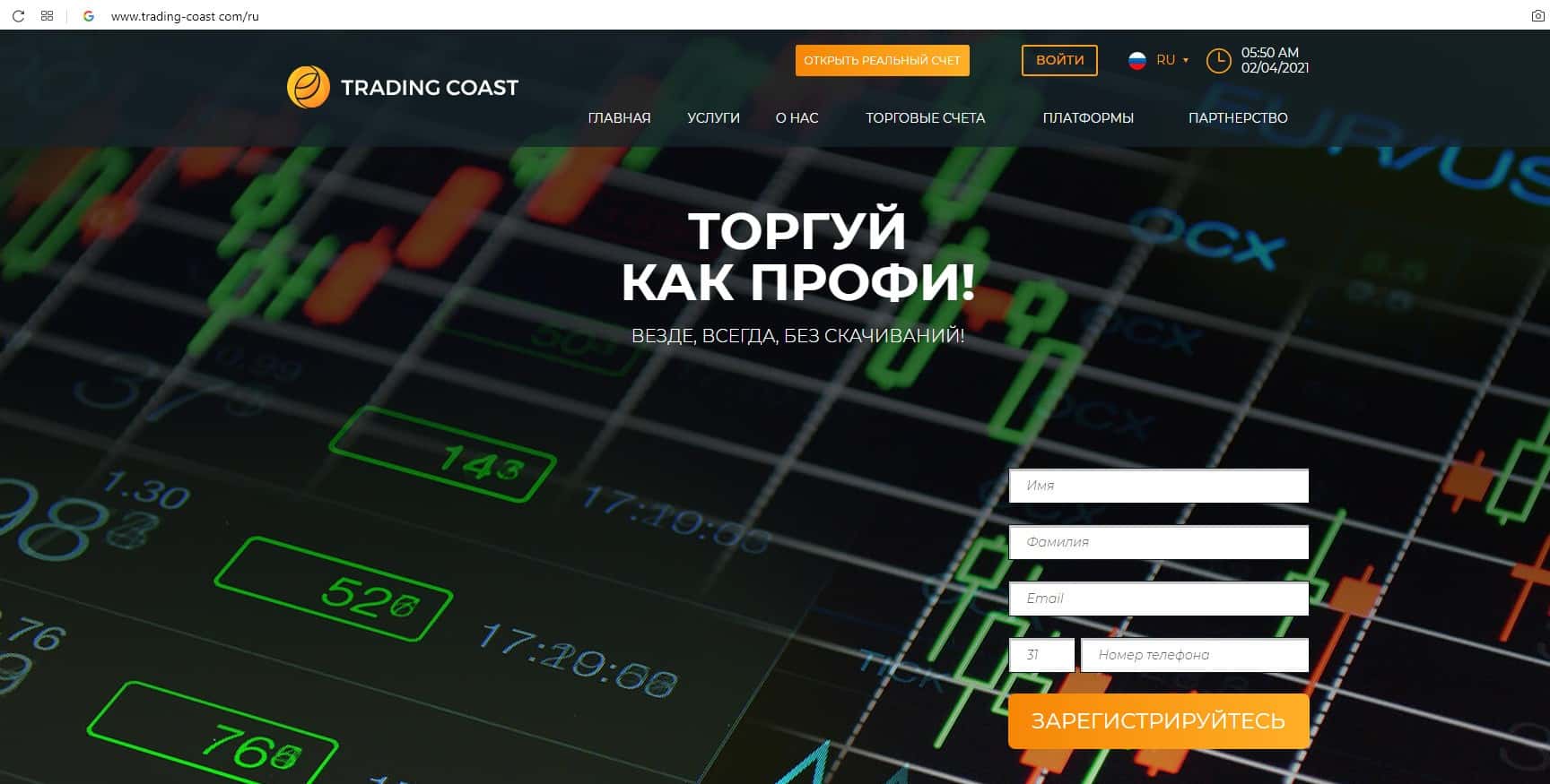- Обзор главной страницы псевдо-брокерской организации Trading Coast