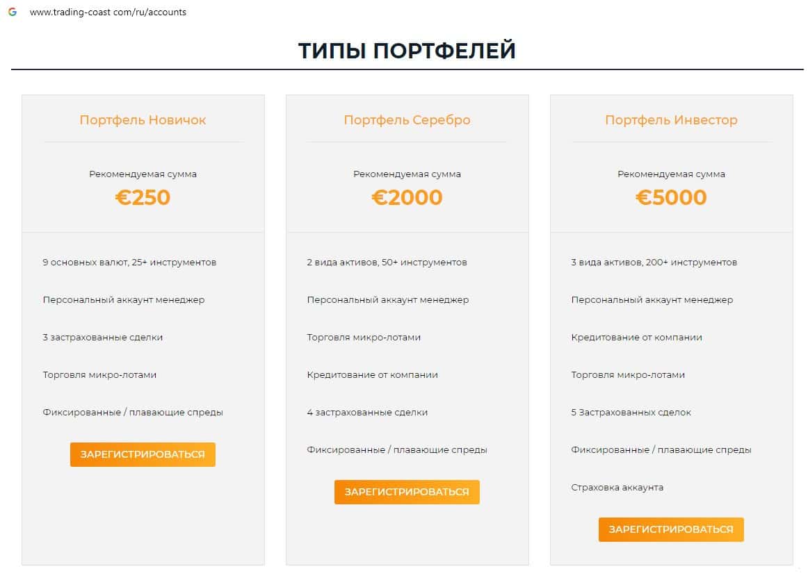 Мошенники Трейдинг Коаст предлагают клиентам на выбор 6 типов торгового счета. Реальный Форекс стартует в основном с суммы в 100000 долларов.