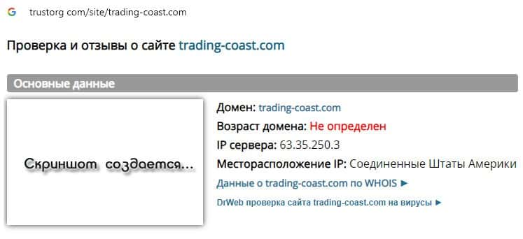 Проверка интернет-портала обманщиков Трейдинг Коаст на trustorg com показала, что возраст домена определить невозможно, мы имеем дело с очередным лохотроном.