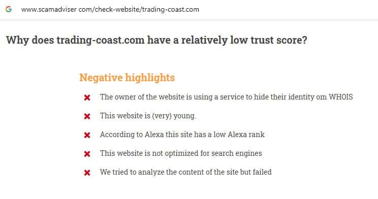 Проверка домена Trading Coast на сайте скамадвайсер ком показала, что у данного сайта низкий рейтинг, а также выявлено множество отрицательных моментов в работе сервера.