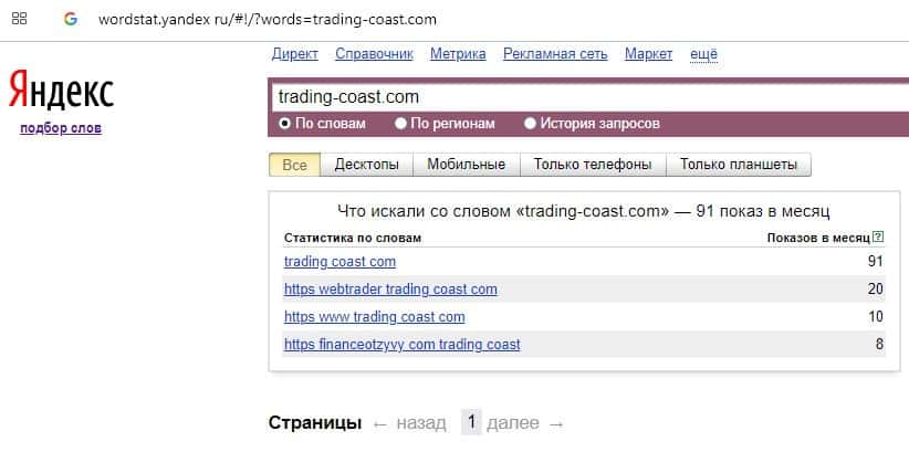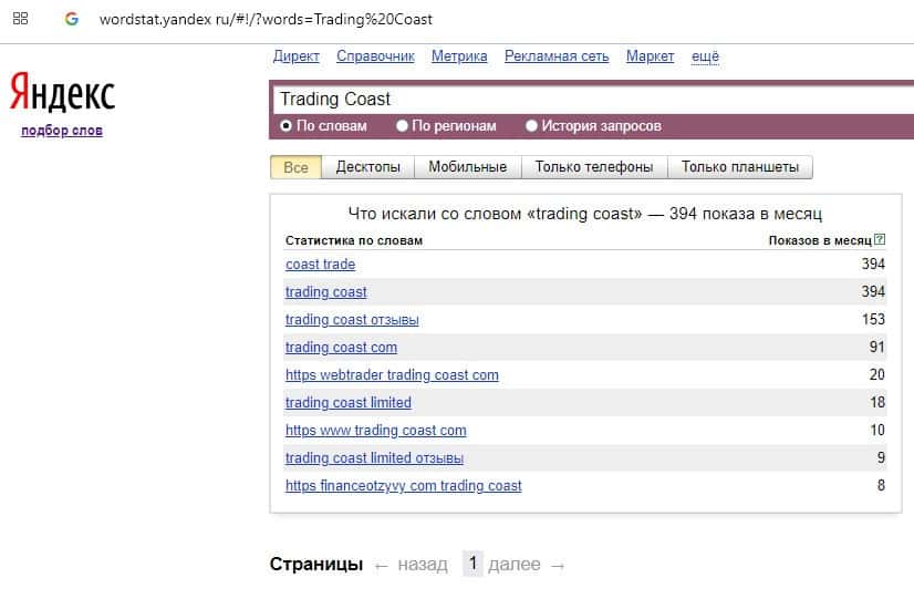 Количество брендовых запросов названия компании на русском языке "Трейдинг Коаст" на wordstat yandex ru составляет 3 показа за месяц.