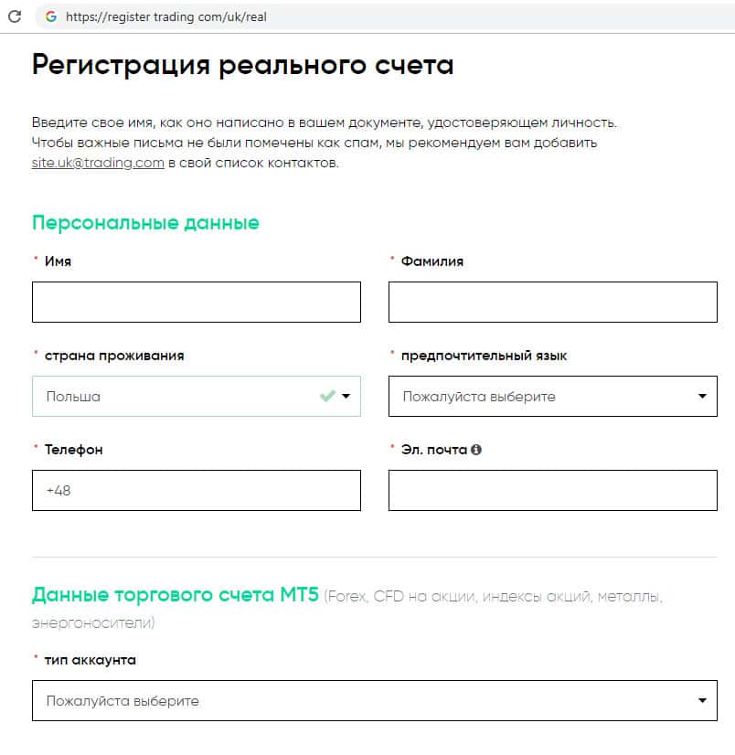 - Скам-брокер Trading Com на своем официальном сайте ведет сбор данных о клиенте