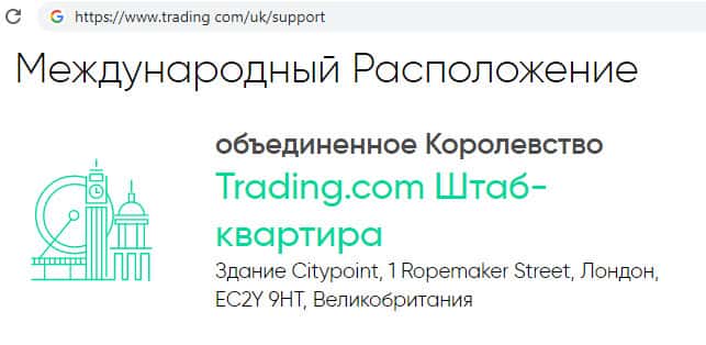 Согласно контактной информации, которую указывает о себе мошенническая организация Трейдинг Ком зарегистрирована в британской столице, Лондоне. Где ныне базируется огромное количество аналогичных брокерских компаний.