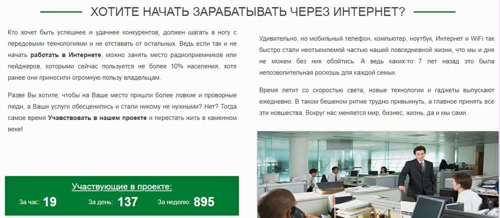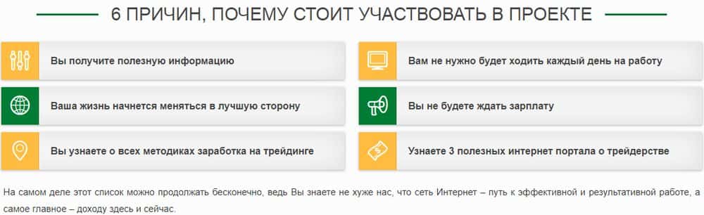 Чтобы впечатлить новичков, жулики повесили псевдо-счетчик с количеством людей, участвующих в проекте и обещают, что после их курсов каждый сможет бросить работу и начать роскошную жизнь, зарабатывая на торгах. Интересно, что всю информацию о проекте можно получить только лично от жуликов после заполнения формы регистрации.