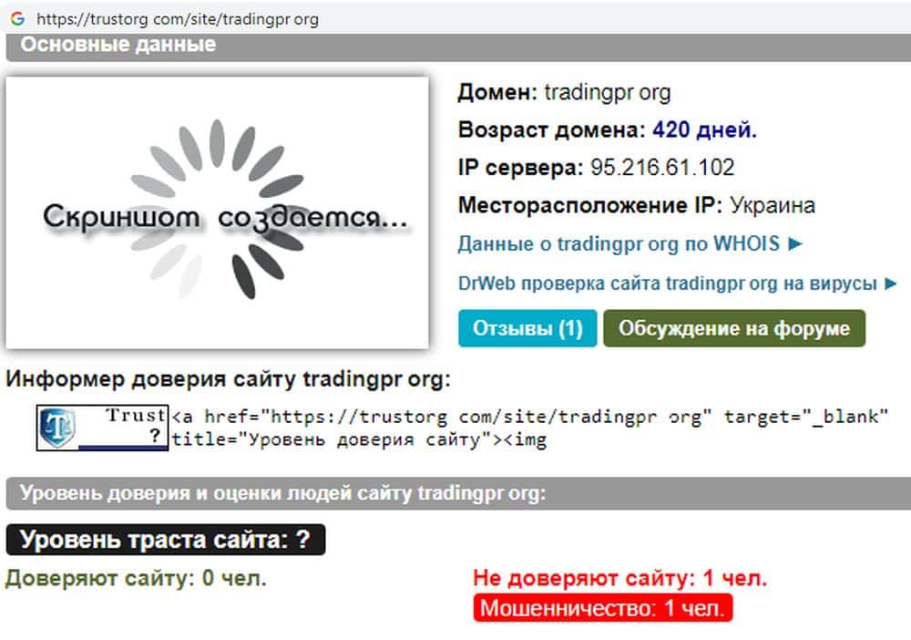 Мошенники TradingPR Org утверждают, что находятся в Москве. При этом IP расположен в Украине. Сам сайт подозревается в мошенничестве, о чем предупреждает ресурс trustorg com. Прибавьте к этому подозрительный контент (на сайте ни одного слова по существу не сказано) и становится понятно, что перед нами склепанная на скорую руку афера.