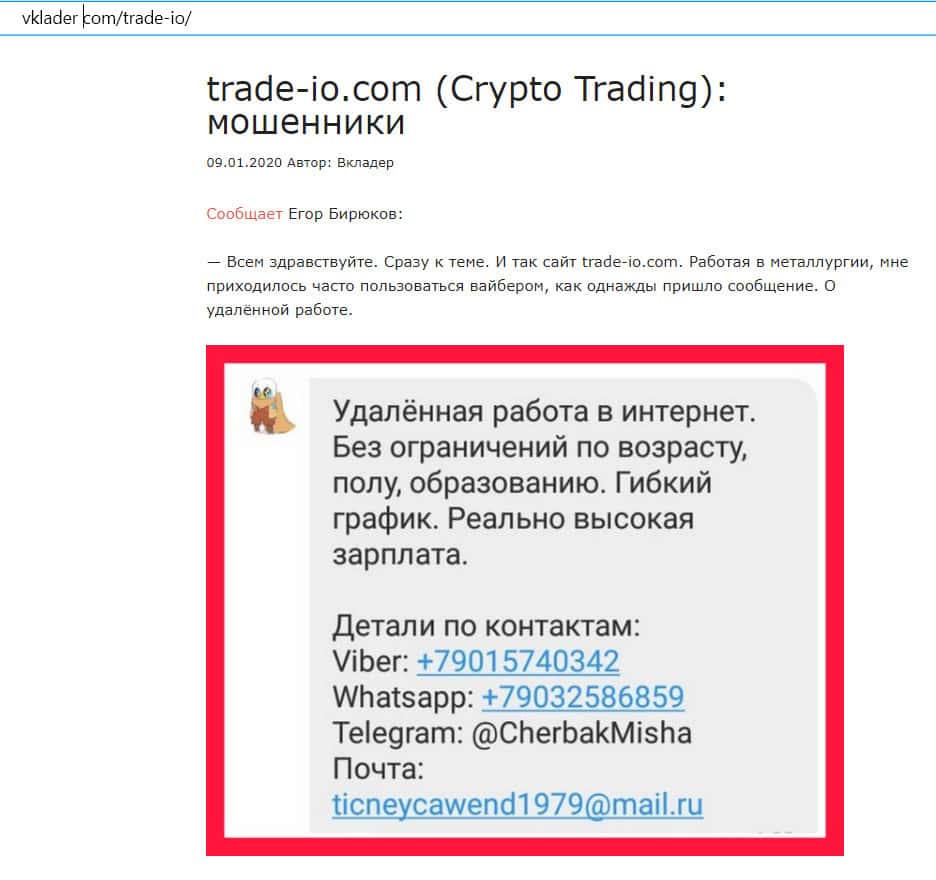 На сайте Вкладер появилась статья о том, как жулики из конторы Трейд Ио разводят людей. Не отличаясь оригинальностью, они просто рассылают сообщения в вайбере с предложениями о высокооплачиваемой работе. Дают контакты в различных мессенджерах (Телеграм, Ватсап, Вайбер) и электронную почту. Надо сказать, что люди уже привыкли к такого рода спаму, но некоторые все равно соглашаются на контакт.