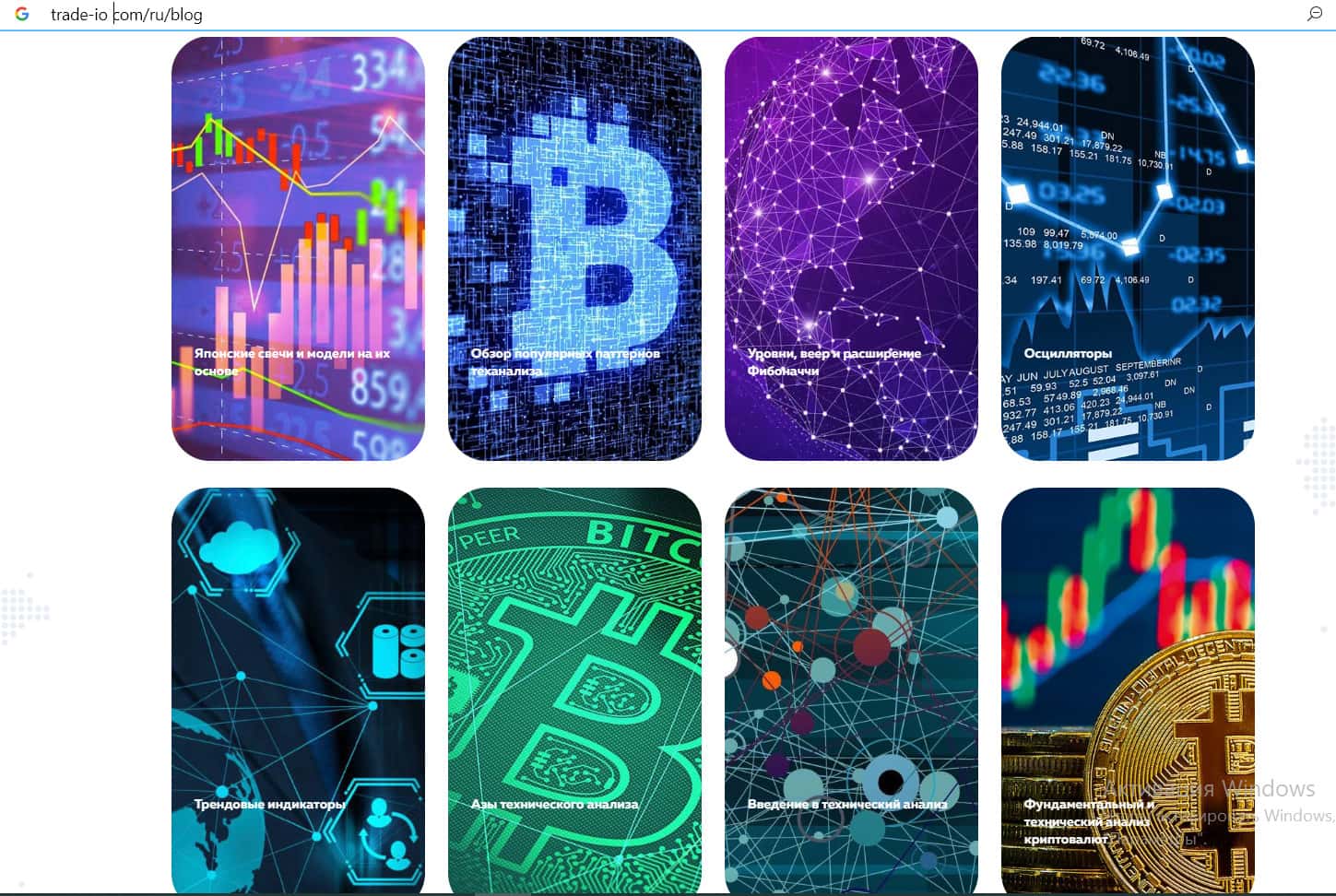 Чтобы пользователям было нескучно, на площадке trade-io com имеется вкладка Блог, где размещены статьи на тематику трейдинга. Клиент может почитать об уровнях Фибоначчи, узнать, что такое японские свечи, вникнуть в азы технического анализа. И кстати говоря, никакой это не блог, а просто набор статей, взятых из интернета. Оформлен раздел красивыми картинками, в яркой цветовой гамме.