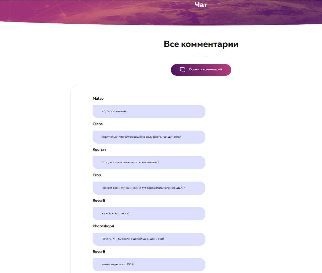 Для создания впечатления о том, что на площадке Трейд Ио кипит деятельность, организаторы лохотрона сделали чат. Он даже выделен в отдельный раздел, чтобы пользователи могли зайти и принять участие в обсуждении торговли. Однако при внимательном рассмотрении обнаруживается, что чат мертвый, более того, это не чат, а просто написанные заранее комментарии от якобы клиентов ресурса.
