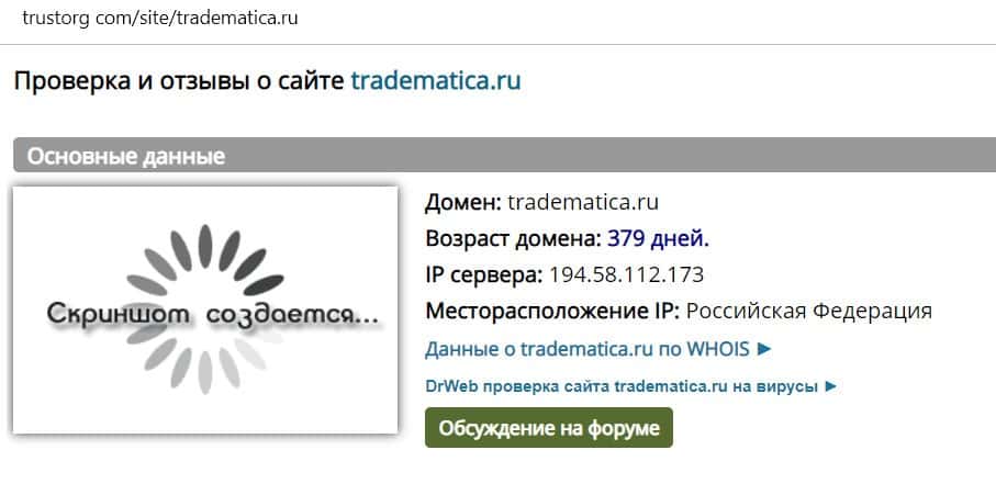 Возраст доменного имени сайта Tradematica Ru составляет 379 дней. Если верить данным с сайта Трасторг, то мошенники работают чуть больше года.