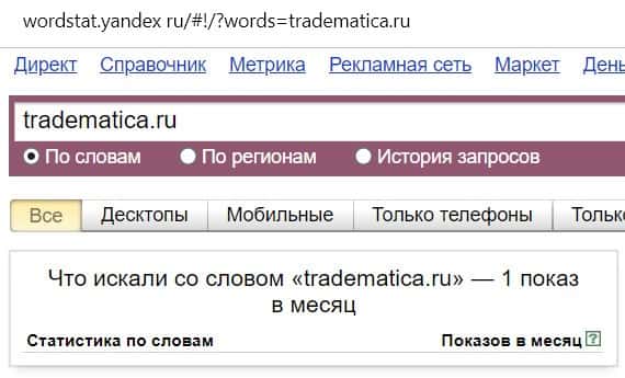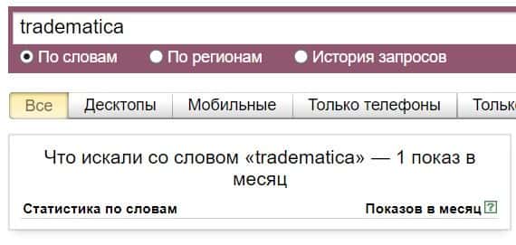 Название бренда на русском языке без пробела "Трейдматика", пользователи искали в системе Яндекс всего 148 раз за месяц.