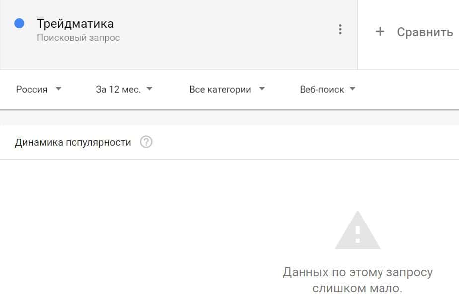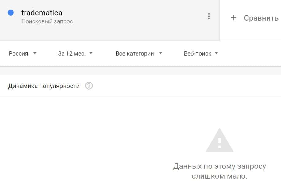 Посмотрим, насколько популярно название бренда "Tradematica", написанное на английском языке. Данных по этому запросу нет, так как никто не искал этот бренд в Гугл.