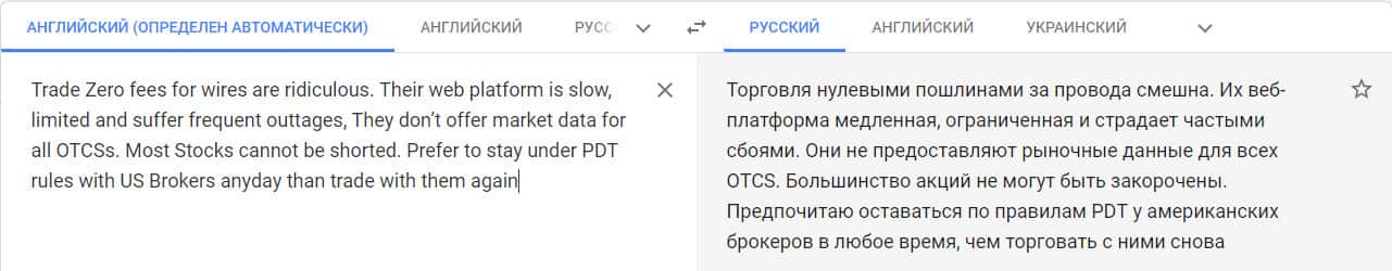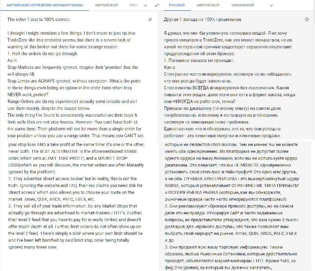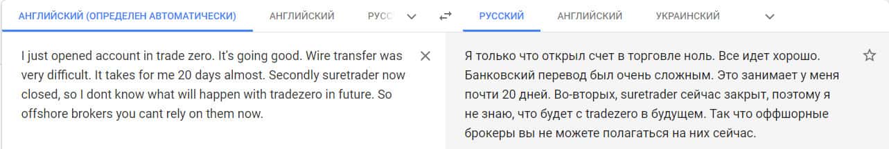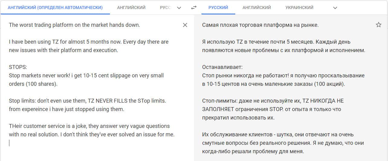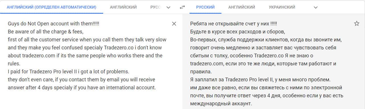 Переведенный отзыв о работе конторы ТредЗеро Лтд на сайте translate.google com