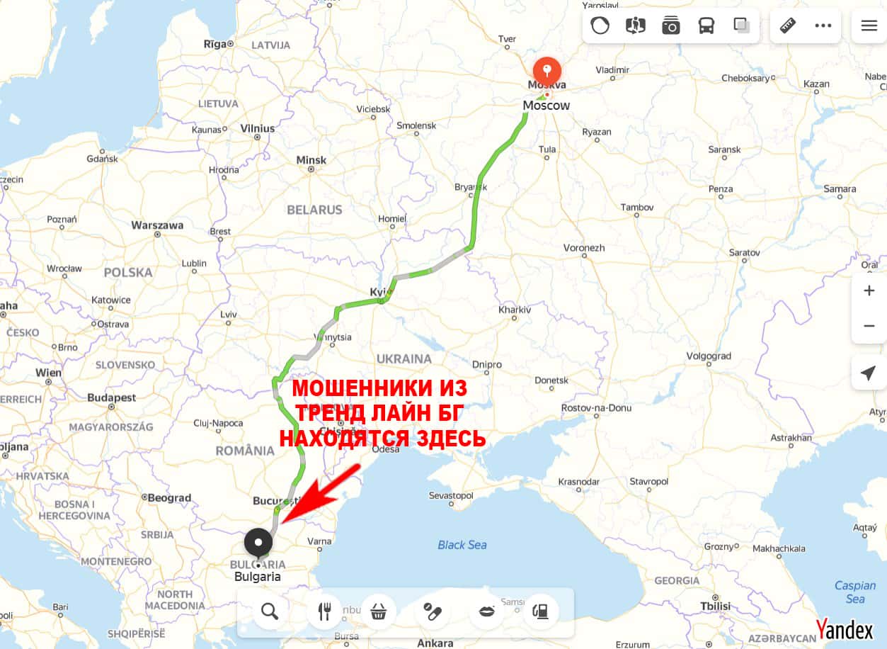 Махинаторы, основавшие надувательский центр Тренд Лайн Бг, находятся в Болгарии, что прекрасно помогает им действовать незаконно, пополняя свои карманы деньгами трейдеров. Скрин карты ниже.