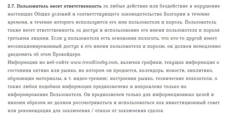 Пункт 2.7. - очередной доказательство сплошного беспредела и разводняка шарлатана Тренд Лайн Бг, поскольку ответственность возлагается лишь на трейдера.